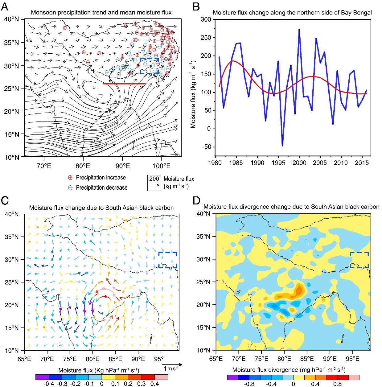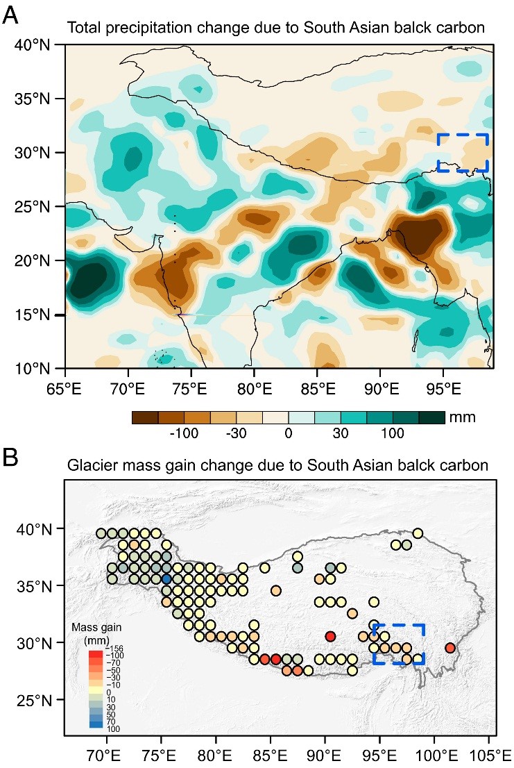 本研究发现南亚黑碳可以通过改变季风水汽输送,间接影响青藏高原东南部地区冰川的物质补给。具体而言,南亚黑碳气溶胶增强了当地的对流活动,使得水汽在南亚当地辐合。黑碳引起的这些气象条件变化,使得更多的水汽在南亚当地形成降水,传输到青藏高原的水汽随之减少,从而使得青藏高原东南部地区季风期降水减少,如图1a所示。南亚黑碳引起的降水减少,导致青藏高原东南部地区冰川的物质补给减少,如图1b所示。因此除大气增温外,南亚黑碳气溶胶引起的水汽输入和降水减少,也是导致青藏高原东南部冰川退缩的重要因素之一。