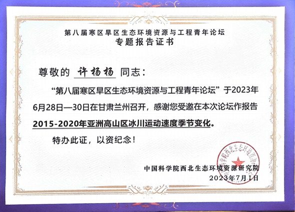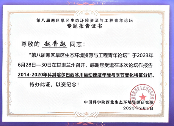 我校研究生赵晋彪、许杨杨参加了此次会议,并在分会场上分别作了题为《2014-2020年科其喀尔巴西冰川运动速度年际与季节变化特征分析》和《2015-2020年亚洲高山区冰川运动速度季节变化》的报告。