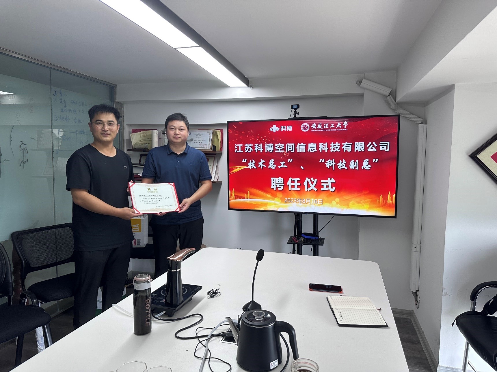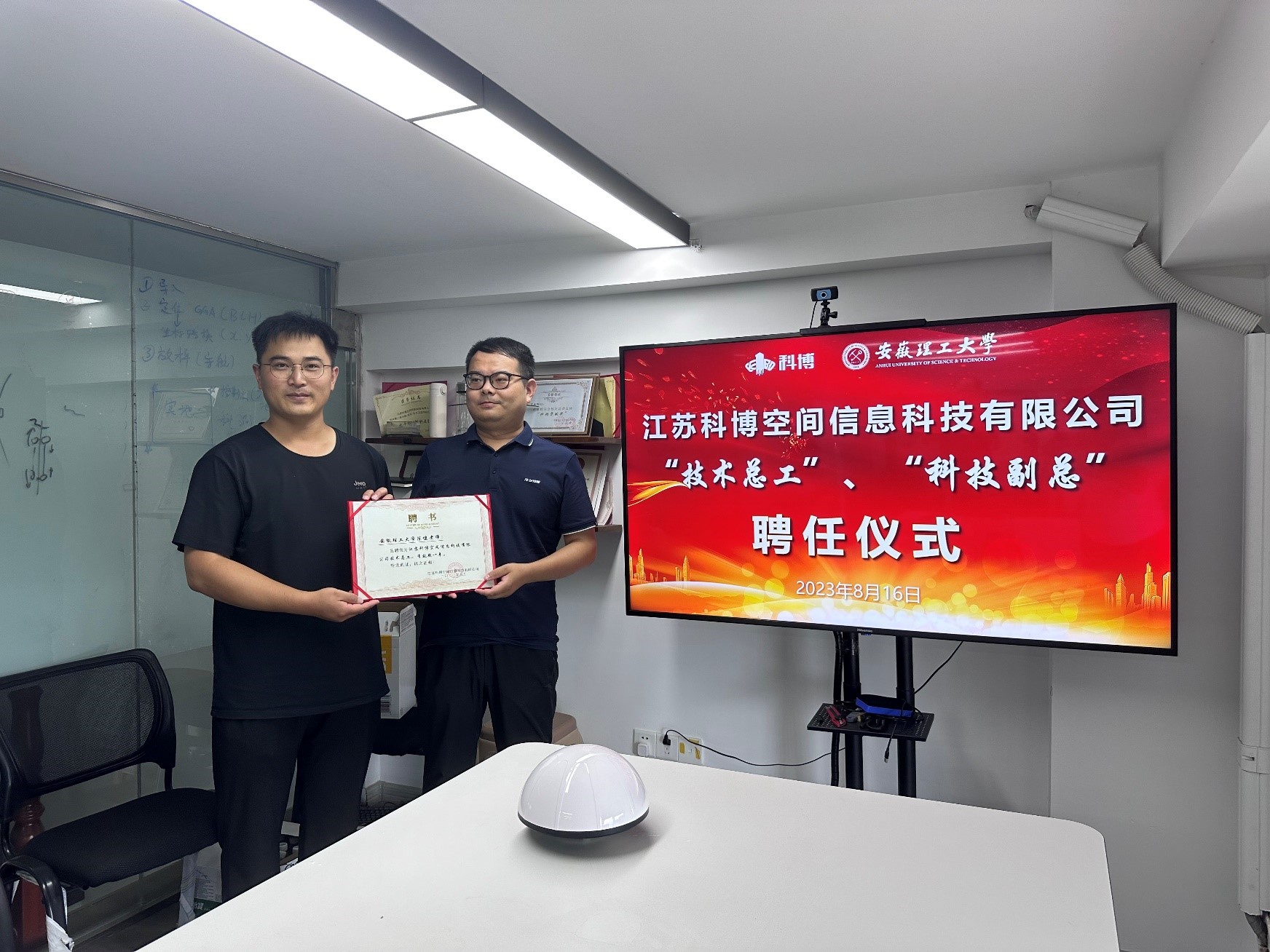 江苏科博空间信息科技有限公司技术部负责人王明明介绍了公司概括、北斗多源智能安全监测等业务,并就科技创新和岗位设置等进行了探讨。为了加强校企深度融合,促进科技协同创新,王明明为必赢官网青年教师颁发了企业挂职聘书。