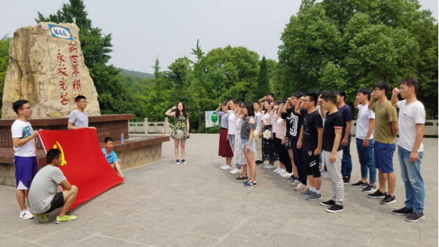 学生党员们在新四军纪念碑前庄严宣誓,面对党旗和新四军纪念碑,学生党员整齐站立,重温了入党誓词:“我志愿加入中国共产党,拥护党的纲领,遵守党的章程……”。宣誓过后,由支部正式党员为预备党员佩戴党徽,象征着我们要学习和继承党的优良传统和精神,不断奋进,做一名合格的共产党员。