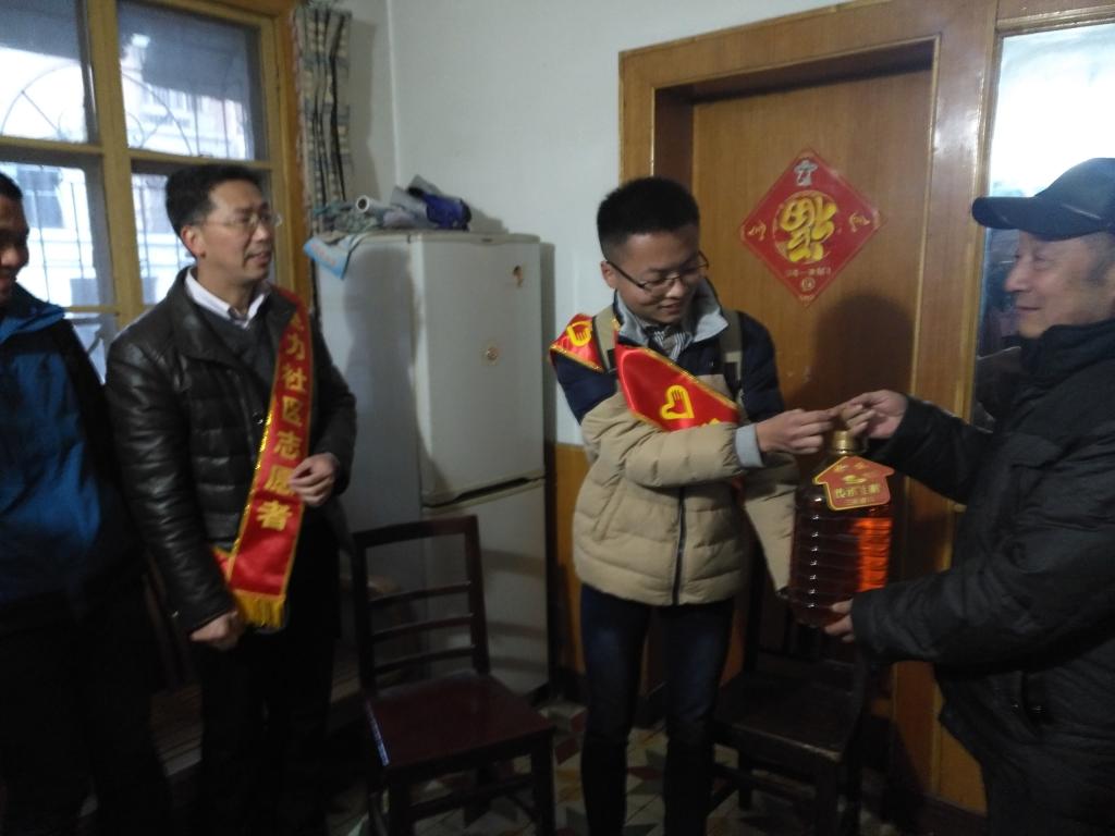 吴军和赵志根带着学院各支部的党员代表走访了电力小区的3户困难群众,详细询问了他们的健康状况和生活上的困难,鼓励他们树立信心,积极面对生活,勇敢面对生活中的挫折。学生党员把带来的大米、食用油等生活必需品交到困难群众手中。