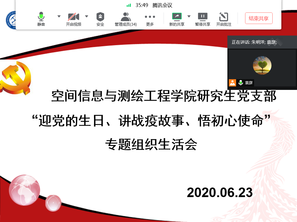 6月24日上午,空测学院研究生党支部以腾讯会议形式召开“迎党的生日、讲战疫故事、悟初心使命”专题组织生活会,在校党员在学院北204会议室集体参加。会议由支部书记袁彦主持。