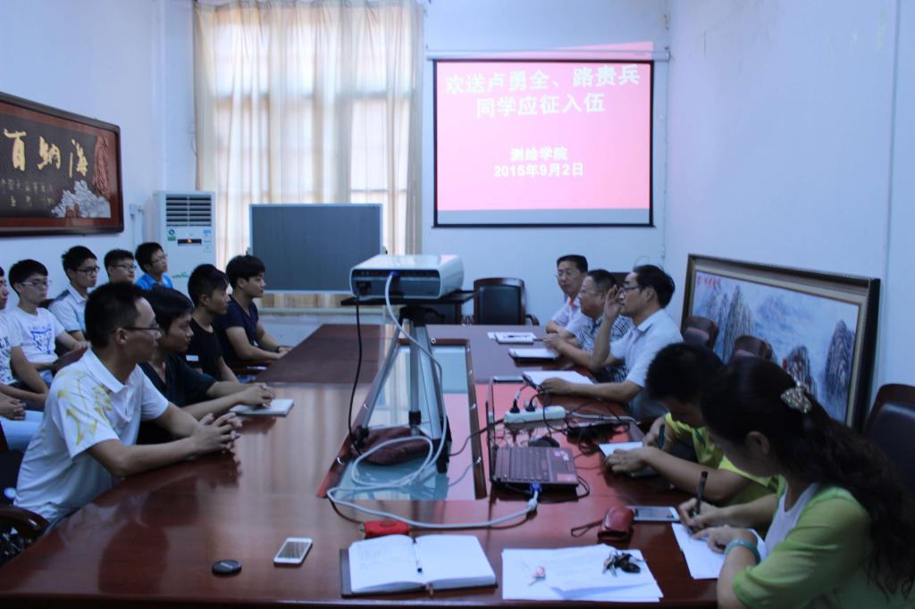 9月2日下午,必赢线路检测3003no1在必赢线路检测3003no1在院学术报告厅召开2015年参军入伍学生欢送会。院长赵志根、党委副书记吴军、行政副院长姚嗣宏,两办老师及应征入伍的学生参加了欢送会。